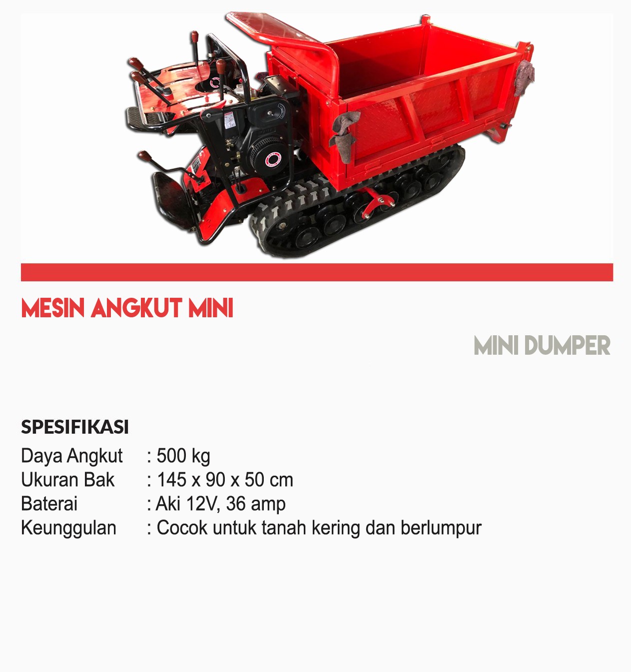 Mesin angkut panen Rp. 231.000.000 Mini Dumper Crawler GPM Spesifikasi Daya Angkut 500 Kg Ukuran Bak 145 x 90 x 50 cm Baterai Aki 12 V, 36 Amp Keunggulan Cocok Untuk tanah kering dan berlumpur Unduh Brosur